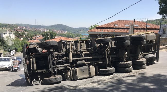 Sarıyer'de yokuş aşağıya indiği esnada frenleri tutmayan kamyon sürücüsü, belediye otobüsüne çarpmamak için direksiyonu kırınca aracı devrilerek yan yattı. Yara almadan kazayı atlatan sürücü kendi imkanlarıyla araçtan çıkarken, un çuvalları ise yola saçıldı.