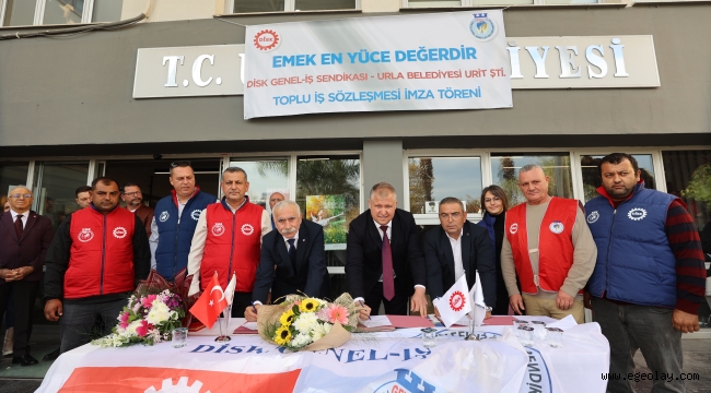 Urla’da memurlar ve kadrolu işçilerin sözleşmelerinin ardından Urla Belediyesi ve DİSK 4 No’lu Şube arasında süren 696 sayılı KHK’lı işçilerin Toplu İş Sözleşmesi (TİS) süreci sonunda da anlaşmaya varıldı. Urla Belediye Başkanı Yüksek Mimar Selçuk Balkan, DİSK Ege Bölge Temsilcisi Memiş Sarı, DİSK 4 No’lu Şube Başkanı Aydın Tekin ve beraberindeki heyet ile Urla Belediye Binasının girişinde yapılan törenle davul ve zurna eşliğinde toplu iş sözleşmesinde imzalar atıldı. 2024-2026 yıllarını kapsayan Urla Belediyesi Urit Şirketinde 330 işçi ve emekçiyi kapsayan Toplu İş Sözleşmesine göre 30 Haziran 2024 tarihinde tüm sosyal haklar dahil olmak üzere en düşük 26 bin TL olan maaş, 1 Temmuz 2024 tarihi itibariyle yüzde 20 vergi diliminde 38 Bin 500 TL’ye, 1 Ocak 2025 tarihinden sonra ise en düşük maaş 45 bin TL’ye yükseltildi.