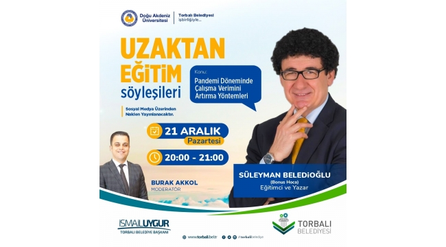 Torbalı’da Uzaktan Eğitim Söyleşileri Torbalı Belediyesi ve Doğu Akdeniz Üniversitesi işbirliği ile 21 Aralık pazartesi günü saat 20.00 ile 21.00 saatleri arasında belediyenin sosyal medya hesaplarında naklen yayınlanacak. Özellikle YKS ve LYS’ye hazırlanan öğrencilere yönelik olarak pandemi döneminde çalışma verimini artırma yöntemlerine değinilecek. Her ay bir eğitimci ile gerçekleşecek olan bu söyleşiler öğrenciler için oldukça verimli olacak.