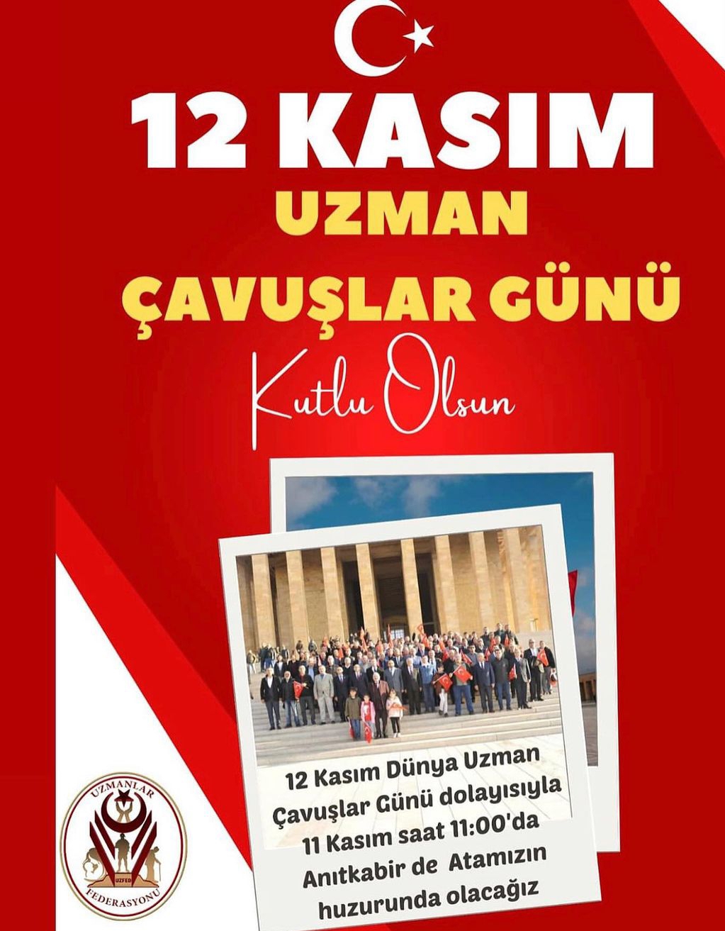 Asrın Aslanları Uzman Çavuşlar Aslanlı yolda yürüyüp Atamızın huzurunda buluşuyor. Uzmanlar Federasyonu Başkanı Ali Tilkici, sosyal medya hesaplarından duyurduğu tören bugün 11 Kasım saat 11:00’de Anıtkabir’de olacak. Uzman Çavuşlar Federasyonu yönetimi , Uzman Çavuşlar, aileleri ve Uzman Çavuşlar (12Kasım) günü için planlanan törene Başkan Ali Tilkici canlı yayınla bütün camia ve uzman çavuşlara gönül verenler ile kahramanların ailelerine seslenerek “Törenimize Kahramanlarımız ve bütün halkımız davetlidir” açıklamasında bulundu.