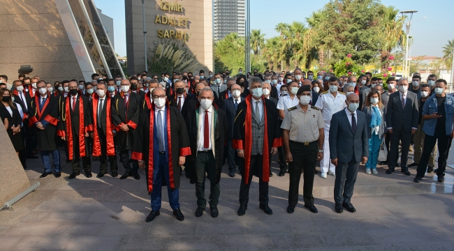 EGEOLAY/Yeni Adli Yıl İzmir Adliyesi’nde yapılan törenle başladı. İzmir Barosu adına Baro Başkanımız Av. Özkan Yücel ve İzmir Adliyesi adına İzmir Cumhuriyet Başsavcısı Kamil Erkut Güre ile İzmir Adalet Komisyonu Başkanı Oktay Tabur tarafından Atatürk Anıtı’na çelenk sunulmasının ardından saygı duruşunda bulunuldu ve İstiklal Marşımız okundu.