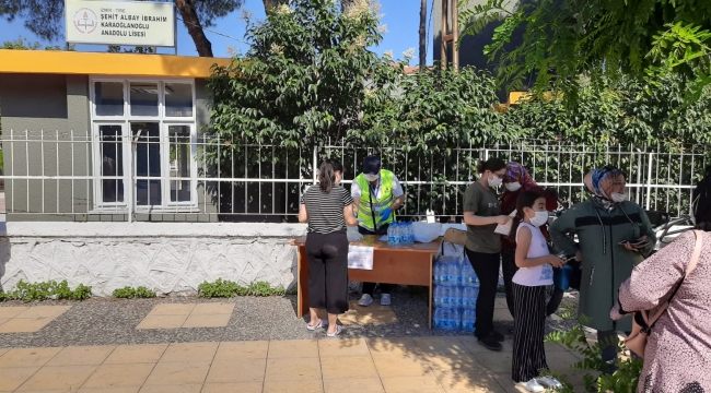 EGEOLAY /İzmir Büyükşehir Belediyesi, bu yıl koronavirüs önlemleri altında yapılan Yükseköğretim Kurumları Sınavı (YKS) öncesi, sınav merkezlerinin önlerinde su ve maske dağıtımı gerçekleştirdi.