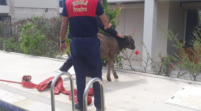 Muğla'nın Bodrum ilçesinde lüks bir sitenin yüzme havuzunun içerisine düşen buzağıyı gören site sakinleri gördükleri manzara karşısında şok oldu. Kafasını havuz merdivenlerine de sıkıştıran buzağı, itfaiye ekipleri tarafından havuzdan çıkarıldı.